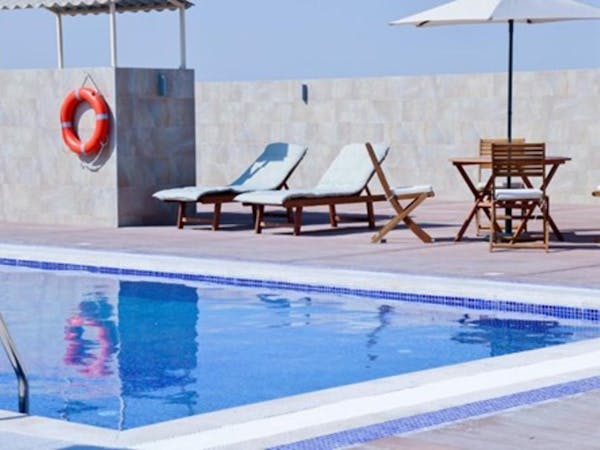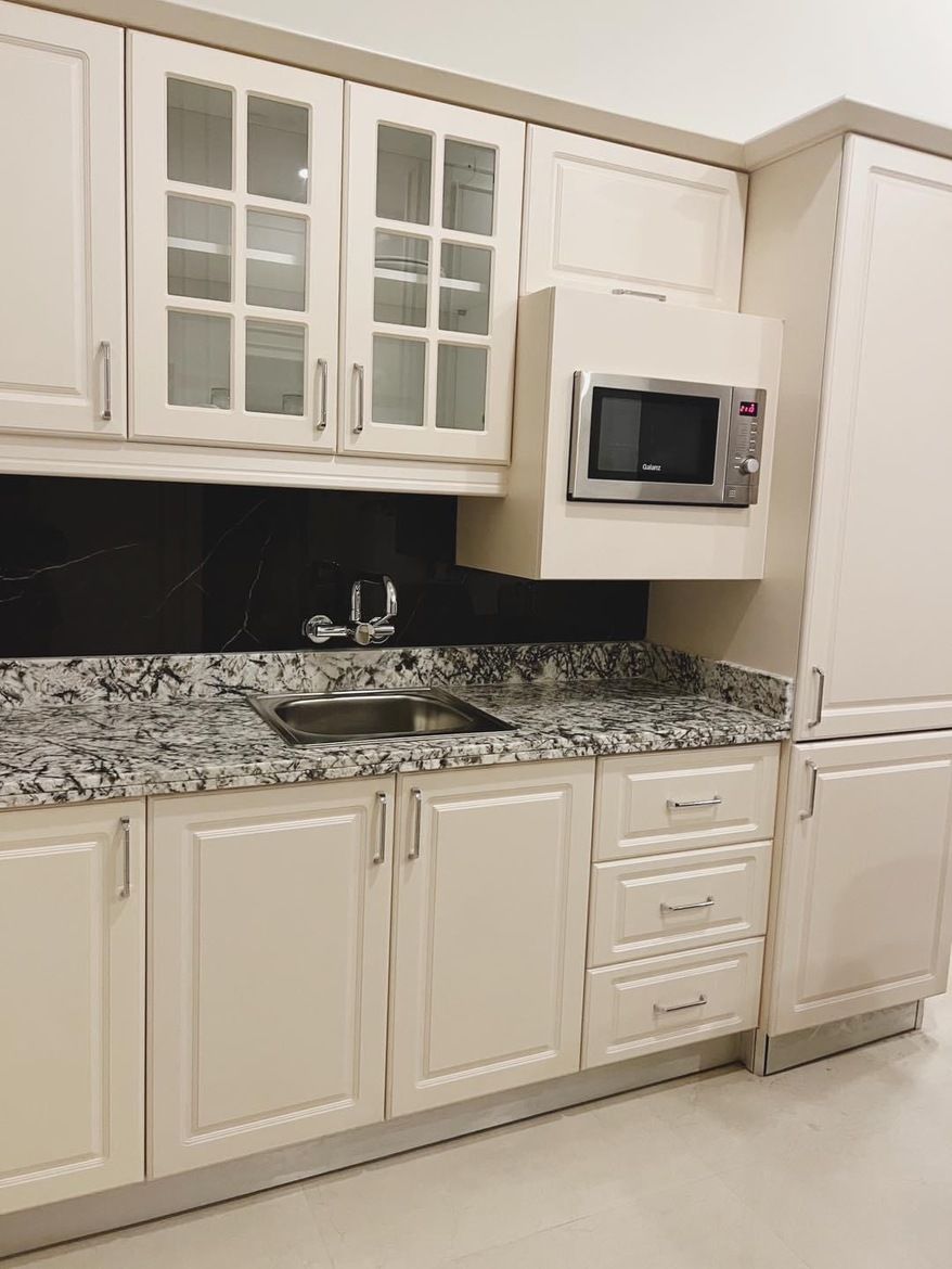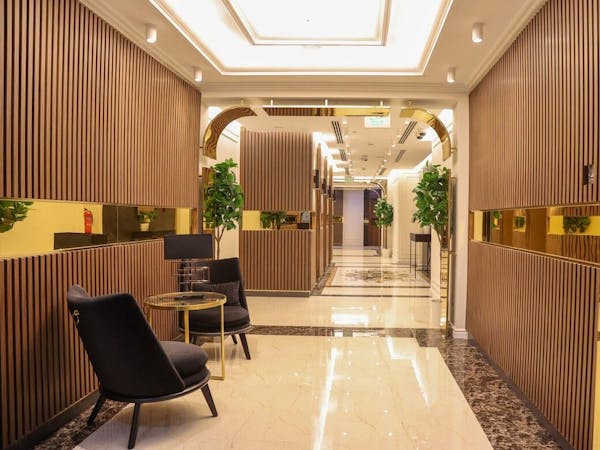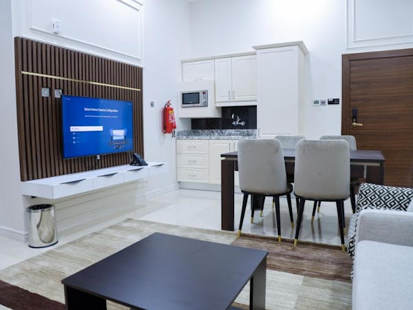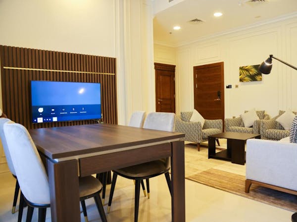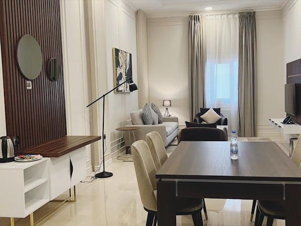 Queen Suite – Where Elegance Meets Comfort - Experience elevated luxury in our Queen Suite, thoughtfully designed to provide both comfort and style in a refined setting. This spacious suite features: A master bedroom with a high-quality king-size bed for ultimate relaxation, A private bathroom with elegant modern finishes , A stylish living room with a comfortable seating area – perfect for relaxing or entertaining , A dining table for in-room meals or casual gatherings Enjoy the convenience of: A microwave, refrigerator, and freezer – ideal for longer stays , A wardrobe, mirror, and hairdryer – everything you need for daily comfort , OSN+ premium TV channels on a flat-screen TV , Dedicated high-speed private internet connection , Direct in-room dining service via QR code and a telephone for seamless service , A tea maker for a warm cup any time , A personal safe to securely store your valuables Whether you're here for business or leisure, the Queen Suite offers a perfect blend of home-like amenities and hotel luxury.