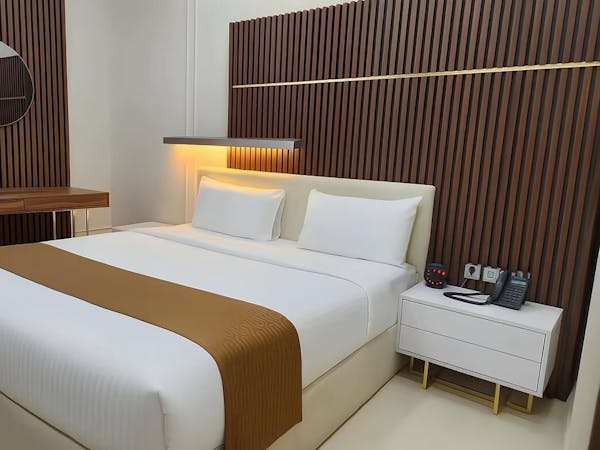 King Suite – Exceptional Comfort, Vast Space Experience unmatched luxury in our King Suite, where comfort meets expansive space. This generously sized suite features an exceptionally large bedroom and living area, perfect for both relaxation and entertaining. The suite includes: A spacious master bedroom with a luxurious king-size bed for ultimate comfort A private bathroom with sleek, modern finishes An extra-large living room with comfortable seating, ideal for relaxation or hosting guests A dining area perfect for in-room meals or informal gatherings Enjoy a range of premium amenities: Microwave, refrigerator, and freezer – perfect for longer stays Wardrobe, mirror, and hairdryer for daily convenience Flat-screen TV with OSN+ premium channels for top entertainment Dedicated high-speed private internet connection In-room dining service via QR code and telephone for seamless service Tea maker for a warm cup at any time Personal safe to secure your valuables Whether you're traveling for business or leisure, the King Suite offers the ideal blend of extensive space, luxurious design, and all the comforts of home, with the added touch of four-star hotel elegance.