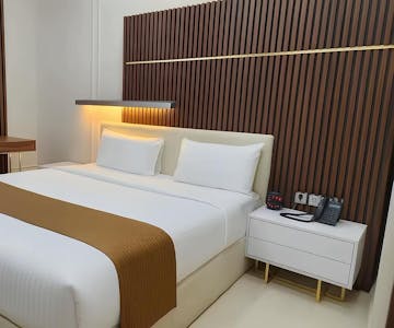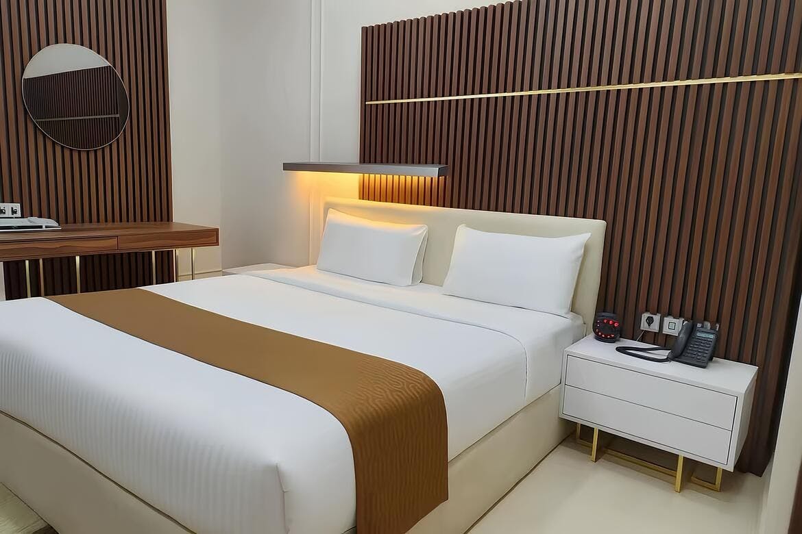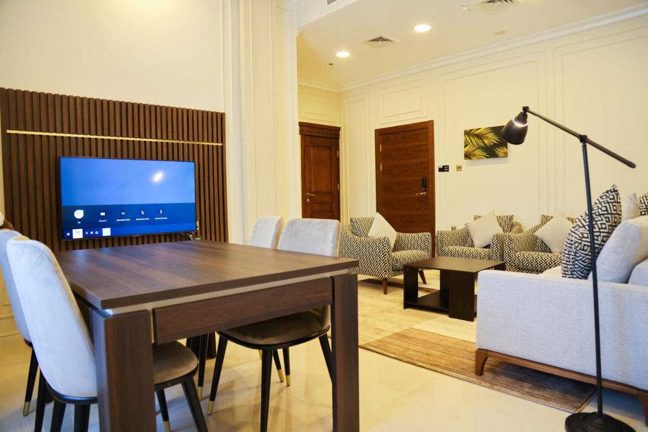 Queen Suite – Where Elegance Meets Comfort - Experience elevated luxury in our Queen Suite, thoughtfully designed to provide both comfort and style in a refined setting. This spacious suite features: A master bedroom with a high-quality king-size bed for ultimate relaxation, A private bathroom with elegant modern finishes , A stylish living room with a comfortable seating area – perfect for relaxing or entertaining , A dining table for in-room meals or casual gatherings Enjoy the convenience of: A microwave, refrigerator, and freezer – ideal for longer stays , A wardrobe, mirror, and hairdryer – everything you need for daily comfort , OSN+ premium TV channels on a flat-screen TV , Dedicated high-speed private internet connection , Direct in-room dining service via QR code and a telephone for seamless service , A tea maker for a warm cup any time , A personal safe to securely store your valuables Whether you're here for business or leisure, the Queen Suite offers a perfect blend of home-like amenities and hotel luxury.